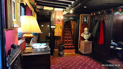 The rain had cleared by the time I left the Ypres Castle, and I retraced my footsteps back to the churchyard. I walk the opposite way around this time and then continued across to where the road narrows before turning a corner, by Lamb House. Turning the corner took me into Mermaid Street which is where I was aiming for, because a third of the way down this steep, and quite narrow, cobbled street is the historic and rather picturesque Mermaid Inn. I stopped for a while on the narrow pavement opposite to take a few, obligatory photos on this lovely old hostelry, which has to be one of Rye’s most best-known attractions. The Mermaid hasn’t changed much since Mrs PBT’s and I stayed here nearly 40 years ago, but why would an establishment with the words “Re-built 1420,” painted on its outside wall, wish to bow to modernity? I wasn't the only one taking photos, as there seemed the usual crop of Far Eastern tourists snapping away, alongside visitors from nearer to home. It was time to step inside, so I used the entrance steps situated below the archway, that leads to the garden and car park at the rear. I acknowledged the receptionist, as I walked past her desk, and then did a sharp left along a corridor, towards the comfortable and cosy bar at the rear of the inn. The bar was busy, and whilst not packed, there were no free tables for me to sit at. Small matter, I made my way to the bar and noticed three cask ales on sale - Harvey’s Best, St Austell Tribute, and a mysterious beer badged as “Mermaid Ale.” I opted for this 3.7% premium bitter (according to the pump-clip), and after inquiring to its origin, the friendly barmaid informed me it was brewed by Young's. I only went for a half, as with nowhere to sit, and very little space at the bar, I felt rather in the way. The bar staff were happy to chat, in between pouring drinks, so I mentioned my stay in 1985. They suggested going along to reception and inquiring about prices and room availability if I fancied booking a return stay. I took this advice as soon as I’d finished my drink, and retraced my steps along the corridor, in order to speak to the receptionist. She went through what was available, but advised that due to the Mermaid’s popularity, I would need to book about four months in advance. She also went through the types of room that the inn offered, so that when I got home, I could surprise Mrs PBT’s with the prospect of a luxury weekend in Rye. I thanked her for her time and patience and in possession of this extra information left the pub. I made my way to the bottom of Mermaid Street and followed the road round until I found myself back in Cinque Ports Street – the road where I’d started out on earlier. it was time now to discover the delights of the Waterworks, so I hurried along until I reached Rye’s first, and so far, only micro-pub. In a previous article – “Change of Plan,” I explained the story behind the pub and its quirky name, so I won’t repeat myself here, but as I was to find out, the Waterworks is a thriving drinking establishment that is popular, not just with locals, but also visitors to Rye. It was no surprise then, as I stepped inside, to find the place rather full. In common with most micro-pubs, the Waterworks has just a single room, with the bar counter adjacent to the door. The beers, and ciders, are kept in a temperature-controlled room, behind the bar, and dispensed by gravity, direct from the cask. The majority of them are locally sourced, which makes sense. The ceiling is festooned with hops, and pump-clips, whilst the walls are hung with various paintings and prints. Given the preponderance of antique shops in Rye, it’s no surprise there are large amounts of bric-a-brac, scattered about the place. There are just six tables of various shapes and sizes, for drinkers to sit at, and the pub has a laudable policy of encouraging customers to move along and make room for other drinkers. A notice reminds patrons that micro-pubs are for sharing, and suggests that visitors should find a seat, sit down, and say hello to the people next to them. This policy is fine with me, so after ordering my beers (I bought two to save coming back up to the bar again), I did exactly what was requested of me, and found a seat on the end of a table. I had a light and a dark beer. The pale beer was a 4.9% Imperial Session IPA, from Only With Love, a micro-brewery based in Uckfield. It was a well-balanced and most enjoyable beer, but the same could not be said about the second beer, Black Udder, from Hop Fuzz Brewery of Hythe. The latter was supposed to have been a milk stout but to me it was more like a dry Irish stout. There was certainly very little in the way of residual sweetness – a characteristic you would normally expect from a milk stout. The beer was still perfectly drinkable but wasn't quite what I expected. If the Waterworks seemed crowded when I arrived, it began to fill up even more over the course of my stay, but people in the main were sensible and following the guidance described above, all those who wanted to sit down, managed to get a seat. As in many pubs there was a hard core of regulars sat at the bar, but the staff were aware of this and managed to serve people approaching the bar, without any hassle. I was hungry by this time and knew from the pub’s website that homemade pork pies and Scotch eggs were on sale behind the bar. I was therefore looking forward to trying one of these, so when I noticed the big chalk cross, scrawled diagonally across the blackboard, my heart sank. I inquired about the pies but was told they wouldn't be available until January, as they are sourced from a nearby bakery, which was closed during the Christmas-New Year break.
